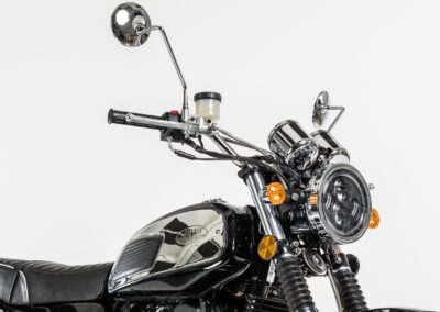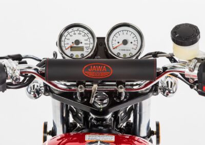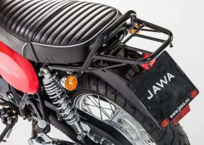 JAWA 650 OHC Sport – Pružný jednoválcový motor si skoro sám říká o to, být použit do motocyklu endurovějšího stylu. Přesně na toto jsme mysleli při realizaci modelu JAWA 650 OHC Sport. Podvozek tohoto modelu je sice identický s modelem JAWA 650 OHC, ale díky polohovatelnému přednímu blatníku, většímu prostoru mezi zadním kolem a blatníkem a také díky řídítkům s hrazdičkou a stylovou rolkou si bez obav můžete dopřát i jízdu po kvalitativně horších komunikacích, než u modelu JAWA 650 OHC. Kapkovitá nádrž v kombinaci se zvednutými tlumiči výfuků v celkovém pojetí evokují přímou návaznost tohoto modelu na historické motocykly JAWA určené pro závody v šestidenní.